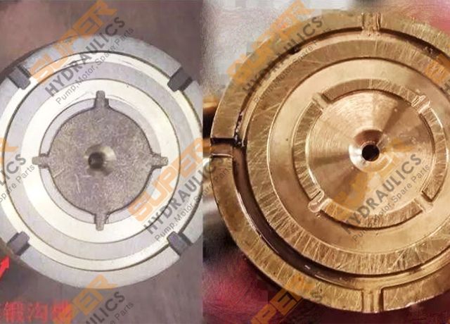 Our company determined that the damaged piston was domestically made based on the patterns left by the turning tool on the sliding shoe surface of the other two pumps. Because the sliding shoe on the piston of this heavy-duty pump made by Rexroth Germany is die-forged, and the surface of the sliding shoe oil reservoir can be seen to be rough after die-forging, while the domestic sliding shoe is machined by machine tools, with machining marks of the turning tool, and the empty groove of the sliding shoe is machined by a milling cutter. There is a big difference between the two after comparison.