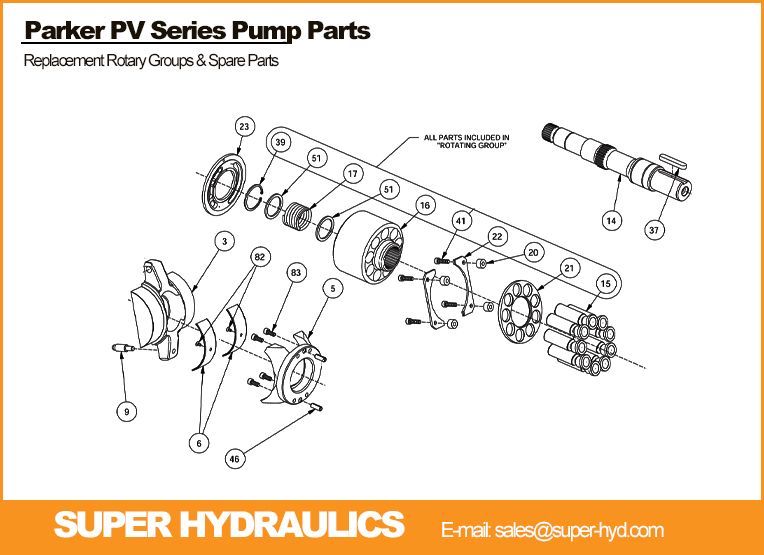 These high quality replacement Parker "PV" series hydraulic piston pumps parts are suitable for aftermarket, repair use, with genuine design and completely interchangeable with Parker "PV" series spare parts and rotary groups.